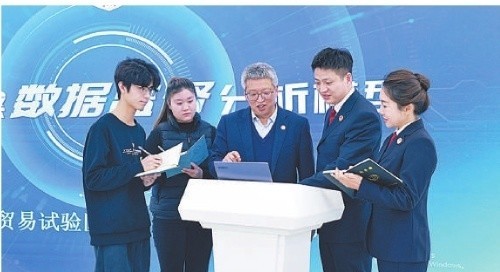 近日,全国人大代表刘代军(中)在河南自由贸易试验区郑州片区检察院了解数字检察机制建设情况。